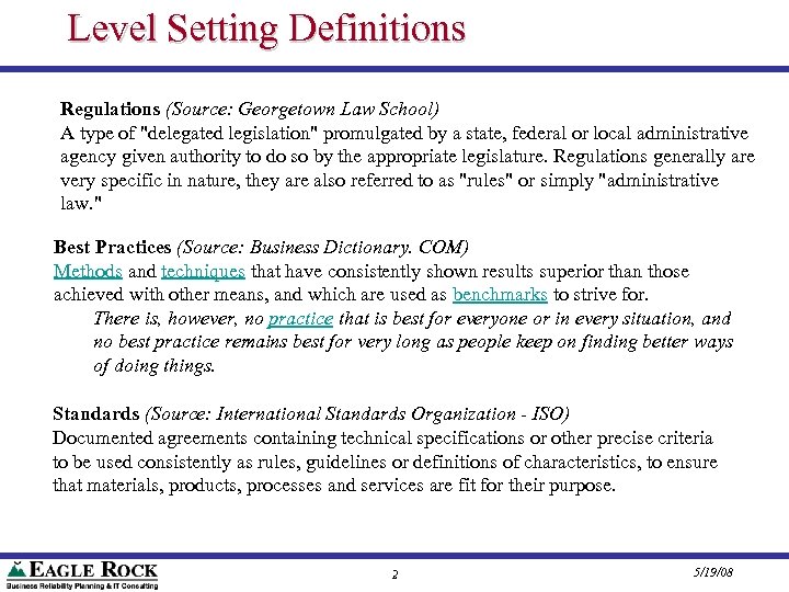Level Setting Definitions Regulations (Source: Georgetown Law School) A type of "delegated legislation" promulgated by a state, federal or local administrative agency given authority to do so by the appropriate legislature. Regulations generally are very specific in nature, they are also referred to as "rules" or simply "administrative law. " Best Practices (Source: Business Dictionary. COM) Methods and techniques that have consistently shown results superior than those achieved with other means, and which are used as benchmarks to strive for. There is, however, no practice that is best for everyone or in every situation, and no best practice remains best for very long as people keep on finding better ways of doing things. Standards (Source: International Standards Organization - ISO) Documented agreements containing technical specifications or other precise criteria to be used consistently as rules, guidelines or definitions of characteristics, to ensure that materials, products, processes and services are fit for their purpose. 2 5/19/08