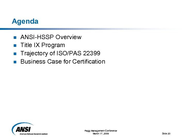 Agenda n n ANSI-HSSP Overview Title IX Program Trajectory of ISO/PAS 22399 Business Case for Certification Flagg Management Conference March 17, 2009 Slide 20