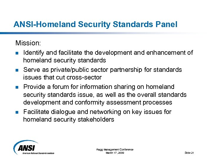 ANSI-Homeland Security Standards Panel Mission: n n Identify and facilitate the development and enhancement of homeland security standards Serve as private/public sector partnership for standards issues that cut cross-sector Provide a forum for information sharing on homeland security standards issue, as well as the overall standards development and conformity assessment processes Facilitate dialogue and networking on key issues for homeland security stakeholders Flagg Management Conference March 17, 2009 Slide 21