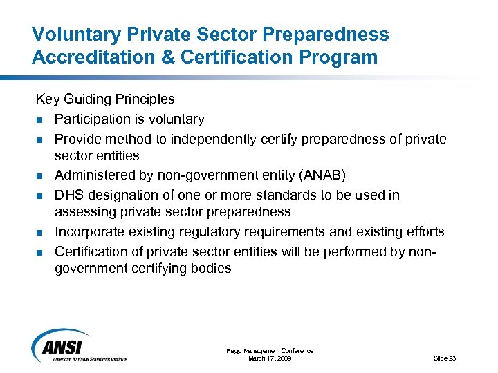 Voluntary Private Sector Preparedness Accreditation & Certification Program n Goal Improve private sector preparedness in disaster management, emergency management, and business continuity to enhance nationwide resilience in an all hazards environment n Background Mandated by the Implementing Recommendations of the 9/11 Commission Act of 2007 to establish a common set of criteria for private sector preparedness Flagg Management Conference March 17, 2009 Slide 22