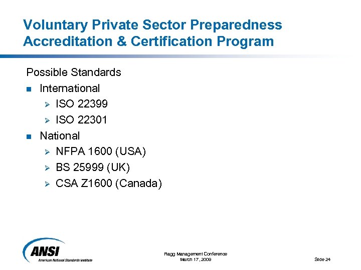 Voluntary Private Sector Preparedness Accreditation & Certification Program Key Guiding Principles n Participation is voluntary n Provide method to independently certify preparedness of private sector entities n Administered by non-government entity (ANAB) n DHS designation of one or more standards to be used in assessing private sector preparedness n Incorporate existing regulatory requirements and existing efforts n Certification of private sector entities will be performed by nongovernment certifying bodies Flagg Management Conference March 17, 2009 Slide 23