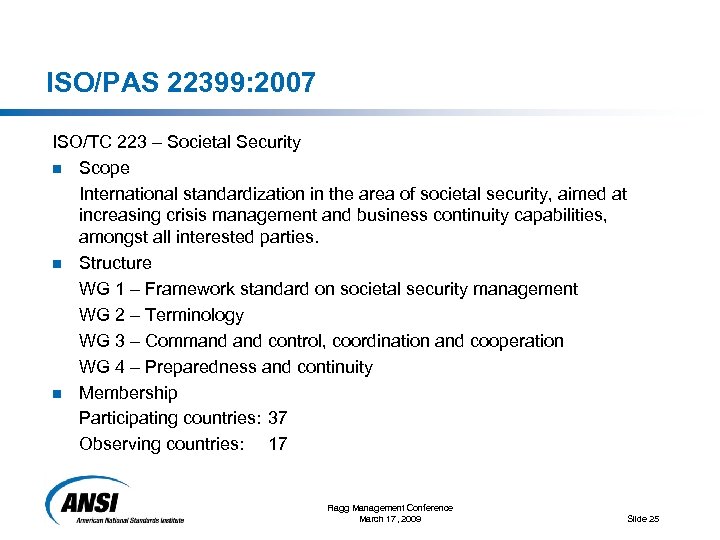 ISO/PAS 22399: 2007 ISO/TC 223 Work Program n ISO/PAS 22399: 2007 Societal security - Guideline for incident preparedness and operational continuity management n Next Steps: Ø Development of ISO 22301 – Management system standard focused on preparedness and continuity management Ø Conversion of ISO 22399 from PAS to Draft International Standard as a guide to ISO 22301 Flagg Management Conference March 17, 2009 Slide 26
