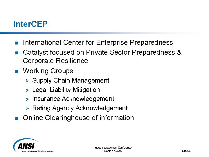 Inter. CEP n n n International Center for Enterprise Preparedness Catalyst focused on Private Sector Preparedness & Corporate Resilience Working Groups Ø Ø n Supply Chain Management Legal Liability Mitigation Insurance Acknowledgement Rating Agency Acknowledgement Online Clearinghouse of information Flagg Management Conference March 17, 2009 Slide 27