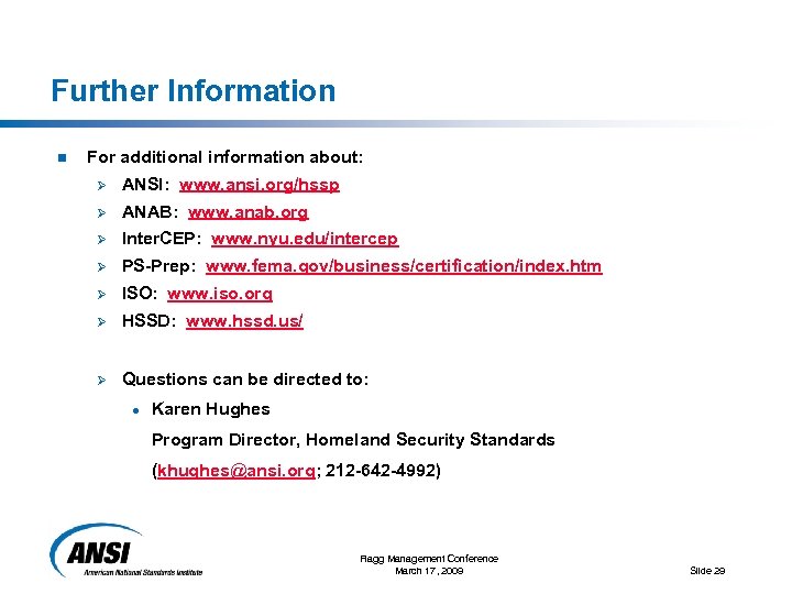 Further Information n For additional information about: Ø ANSI: www. ansi. org/hssp Ø ANAB: www. anab. org Ø Inter. CEP: www. nyu. edu/intercep Ø PS-Prep: www. fema. gov/business/certification/index. htm Ø ISO: www. iso. org Ø HSSD: www. hssd. us/ Ø Questions can be directed to: l Karen Hughes Program Director, Homeland Security Standards (khughes@ansi. org; 212 -642 -4992) Flagg Management Conference March 17, 2009 Slide 29