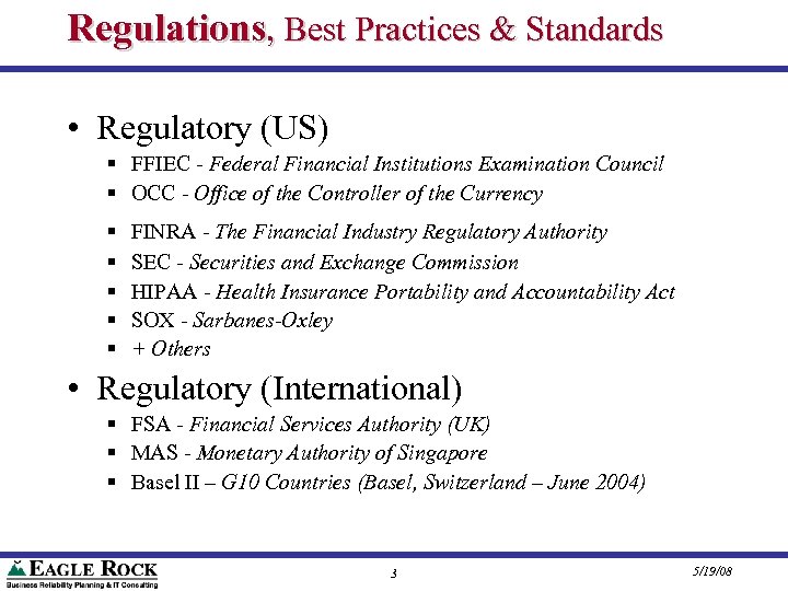 Regulations, Best Practices & Standards • Regulatory (US) § FFIEC - Federal Financial Institutions Examination Council § OCC - Office of the Controller of the Currency § § § FINRA - The Financial Industry Regulatory Authority SEC - Securities and Exchange Commission HIPAA - Health Insurance Portability and Accountability Act SOX - Sarbanes-Oxley + Others • Regulatory (International) § FSA - Financial Services Authority (UK) § MAS - Monetary Authority of Singapore § Basel II – G 10 Countries (Basel, Switzerland – June 2004) 3 5/19/08