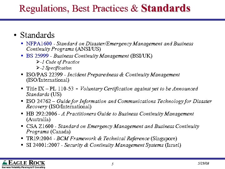 Regulations, Best Practices & Standards • Best Practices § ASIS International - Preparedness & Continuity Management Best Practice Standard § DRII/BCI - Professional Practices for Business Continuity Planners § BCI - The BCI Good Practice Guidelines 2007 (United Kingdom) § DRJ/DRII - Generally Accepted Practices (GAP) § Basel Committee on Banking Supervision - High Level Principles for Business Continuity (2006) 4 5/19/08
