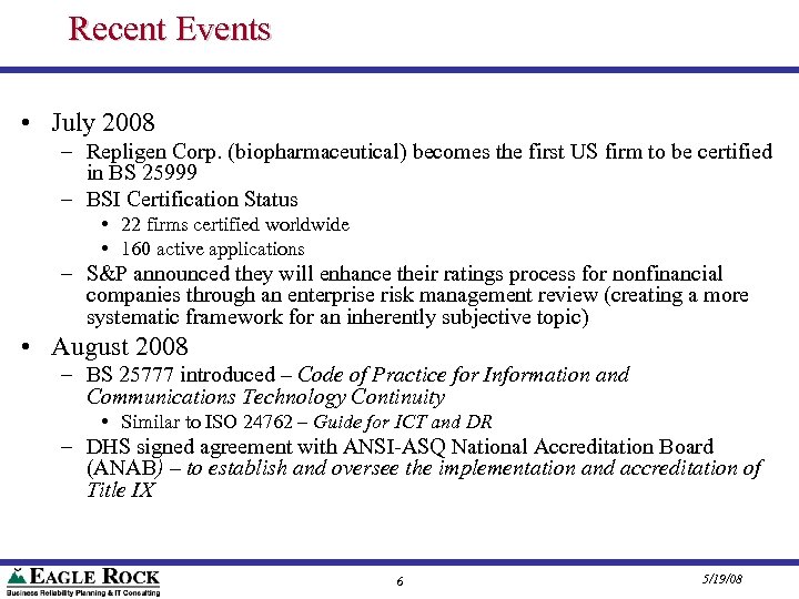 Regulations, Best Practices & Standards • Standards § NFPA 1600 - Standard on Disaster/Emergency Management and Business Continuity Programs (ANSI/US) § BS 25999 - Business Continuity Management (BSI/UK) Ø-1 Code of Practice Ø-2 Specification § ISO/PAS 22399 - Incident Preparedness & Continuity Management (ISO/International) § Title IX – PL 110 -53 - Voluntary Certification against yet to be Announced Standards (US) § ISO 24762 – Guide for Information and Communications Technology for Disaster Recovery (ISO/International) § HB 292: 2006 - A Practitioners Guide to Business Continuity Management (Australia) § CSA Z 1600 - Standard on Emergency Management and Business Continuity Programs (Canada) § TR 19: 2004 - BCM Framework & Technical Reference (Singapore) § SI 24001: 2007 - Security & Continuity Management Systems (Israel) 5 5/19/08