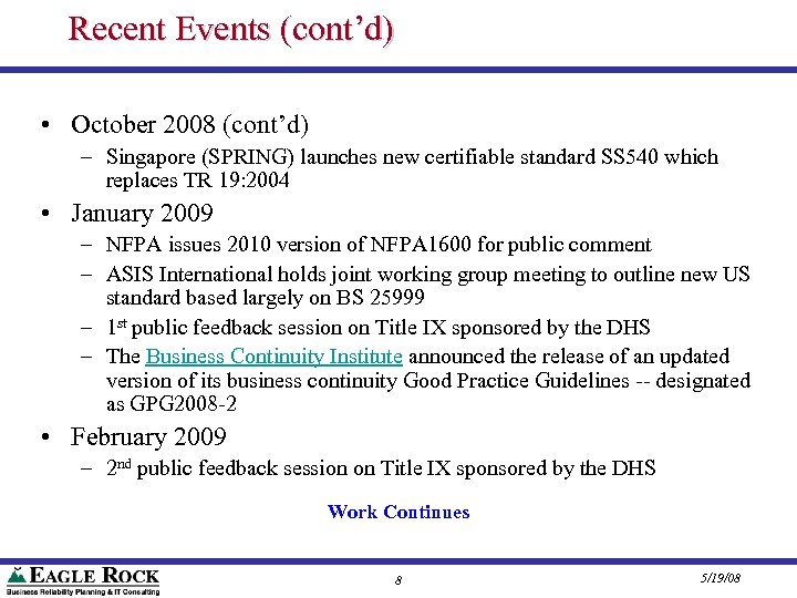 Recent Events (cont’d) • August 2008 (cont’d) – ASIS announces plans for a new US Business Continuity and Risk standard • Solicits the support of ANSI organization – ASIS is an ANSI accredited Standards Development Organization (SDO) • DRII protests and rallies others to do the same – Carnegie Mellon – Cert Resiliency Framework Code of Practice Standards Crosswalk (11 standards) published • October 2008 – ANSI Homeland Security Standards Panel discussion • Subject was Public law 110 -53 Title XI voluntary standards – ASIS hosted stakeholder deliberation meeting and then reaffirms its direction in developing a new ANSI standard 7 5/19/08