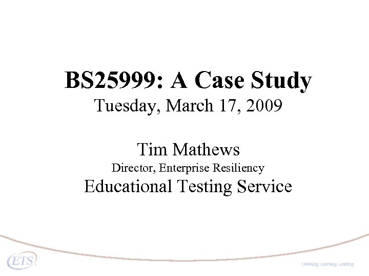 BS 25999: A Case Study Tuesday, March 17, 2009 Tim Mathews Director, Enterprise Resiliency Educational Testing Service