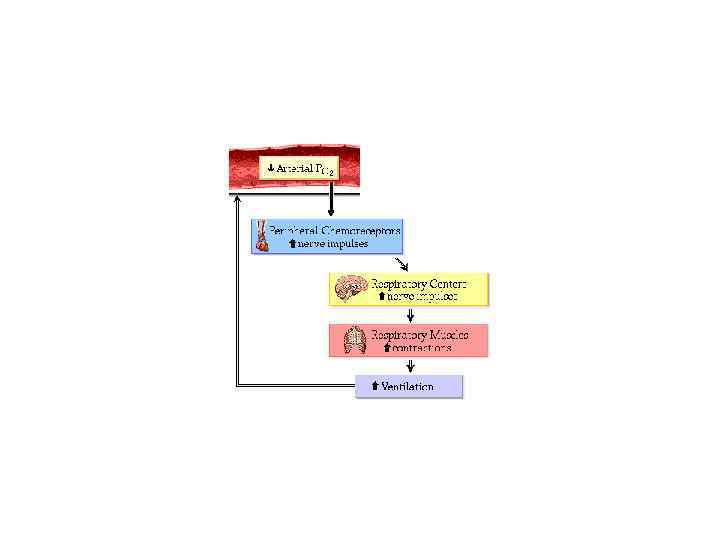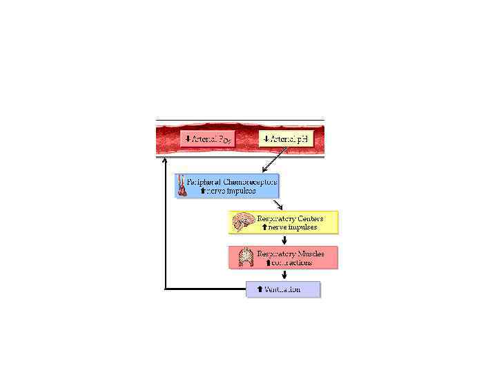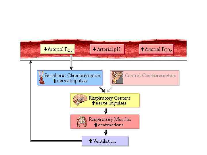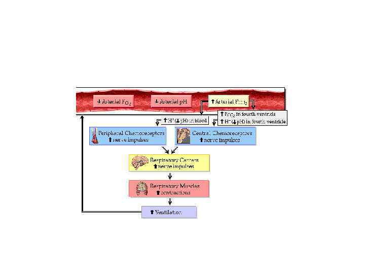 Гиперкапния ( РСО 2) стимулирует лёгочную вентиляцию ГИПЕРКАПНИЯ ( Периферические хеморецепторы РСО 2) Центральные хеморецепторы Дыхательный центр Дыхательная мускулатура ВЕНТИЛЯЦИЯ (в 8 раз)