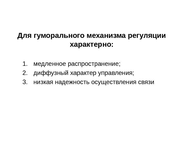 Для гуморального механизма регуляции характерно: 1. медленное распространение; 2. диффузный характер управления; 3. низкая надежность осуществления связи