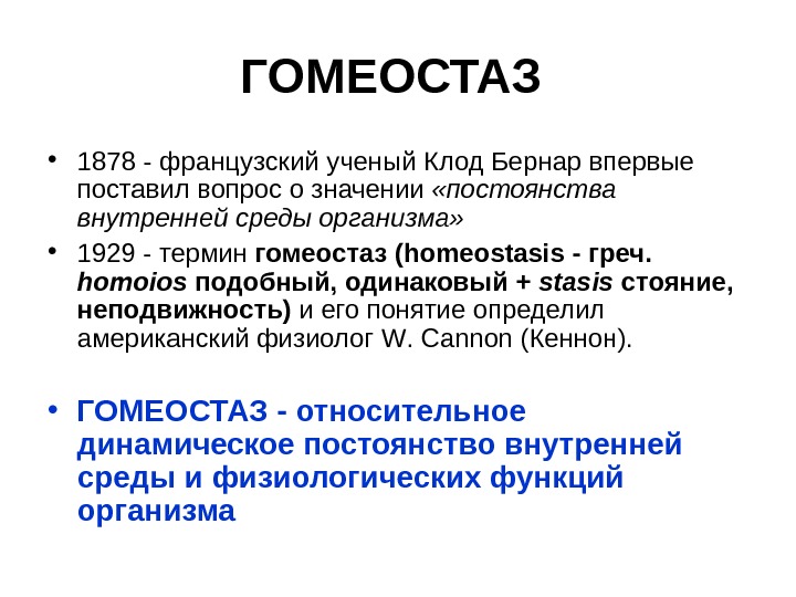 ГОМЕОСТАЗ • 1878 — французский ученый Клод Бернар впервые поставил вопрос о значении «постоянства внутренней среды организма» • 1929 — термин гомеостаз ( homeostasis — греч. homoios подобный, одинаковый + stasis стояние, неподвижность) и его понятие определил американский физиолог W. Cannon (Кеннон). • ГОМЕОСТАЗ — относительное динамическое постоянство внутренней среды и физиологических функций организма