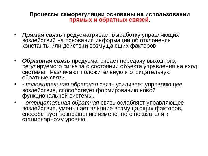 Процессы саморегуляции основаны на использовании прямых и обратных связей. • Прямая связь предусматривает выработку управляющих воздействий на основании информации об отклонении константы или действии возмущающих факторов. • Обратная связь предусматривает передачу выходного, регулируемого сигнала о состоянии объекта управления на вход системы. Различают положительную и отрицательную обратные связи. • — положительная обратная связь усиливает управляющее воздействие, способствует формированию новой функциональной системы. • — отрицательная обратная связь ослабляет управляющее воздействие, уменьшает влияние возмущающих факторов, способствует возвращению измененного показателя к стационарному уровню.
