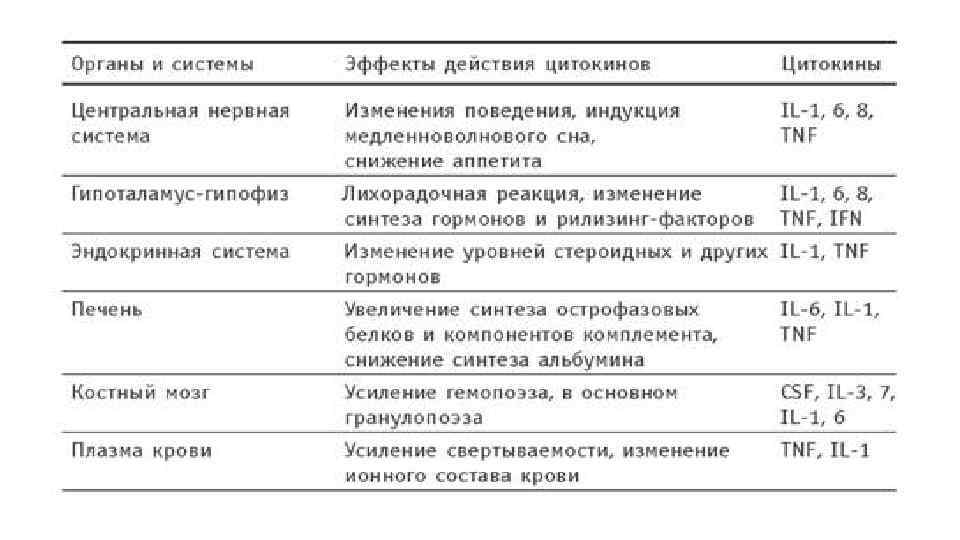 Общие биологические действия ИЛ-1, ИЛ-6 и ФНОα Активация T-клеток и B-клеток. Иммунологические Неспецифическая резистентность к свойства инфекции. Активация гипоталамо-гипофизонадпочечной оси. Нейроэндокринные Подавление гипоталамо-гипофизодействия гонадной оси. Подавление гипоталамо-гипофизотиреоидной оси. Влияние на ЦНС Анорексия. Гиперметаболизм. Лихорадка. Влияние на печень Синтез белков острой фазы