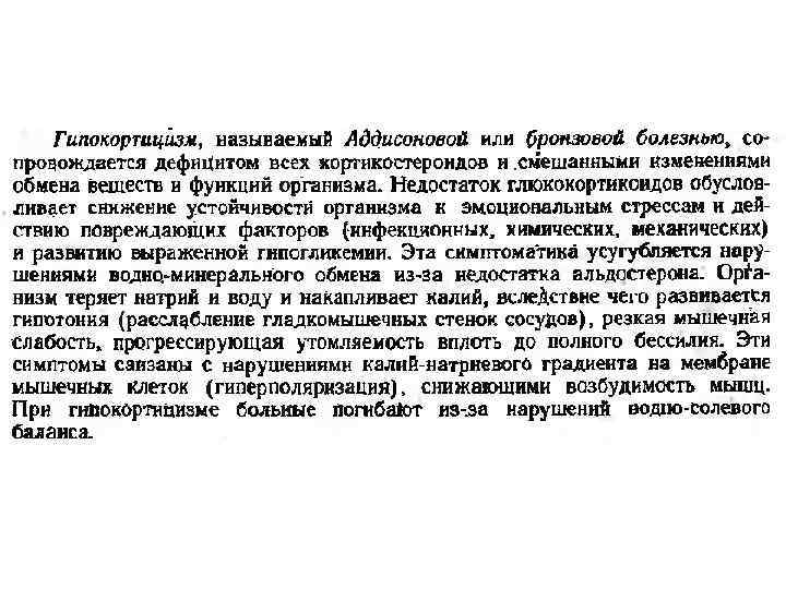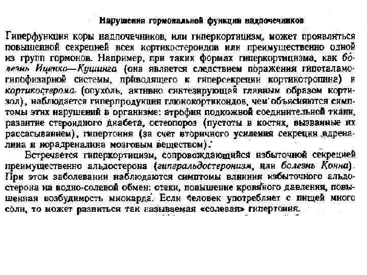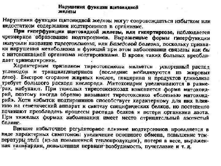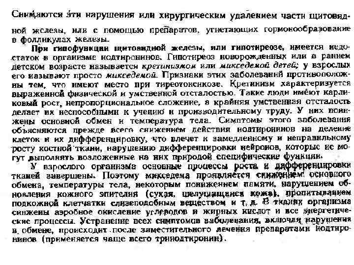 Другие формы гипотиреоза возникают в связи с генетическими нарушениями синтеза гормонов щитовидной железы или вследствие аутоиммунного разрушения железы. Гипотиреоз может наблюдаться также при нарушении секреции ТТГ гипофизом и ТРГ гипоталамусом. При отсутствии гормонов щитовидной железы в период эмбрионального развития наблюдается умственная отсталость. Синдром полного отсутствия у детей тиреоидных гормонов называют кретинизмом. Снижение окислительных процессов и понижение синтеза белка приводят к задержке роста у детей. У взрослых недостаточность функции щитовидной железы вызывает умственную и физическую отсталость. При этом происходит нарушение белкового (понижение синтеза и распада белка), углеводного (гипогликемия), водного и минерального обмена, наблюдается брадикардия. Этот синдром называют микседемой; он сопровождается тестовидным утолщением кожи, связанным с увеличением объема соединительной ткани и задержкой в ней воды и мукопротеинов.