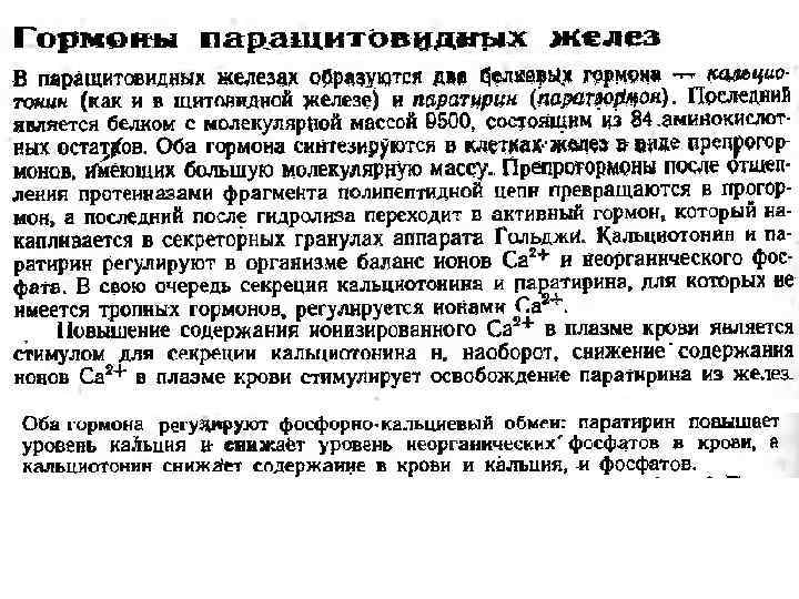 Гормоны паращитовидных желез паратиреоидный гормон Биохимическая - повышает концентрацию функция Ca+2 в крови за счёт растворения костной ткани; - в почках повышается степень обратного всасывания в кровь Ca+2 и уменьшается – фосфат-иона ИТОГ: костная ткань теряет Ca+2: В крови растёт уровень Ca+2 и снижается фосфатов. Через почки с мочой выделяется больше фосфатов. Патологии Вторичный гиперпаратереоз можно наблюдать при почечной недостаточности, т. к. она приводит к снижению синтеза Кц. То снижение уровня всасывания Ca+2 вторичное высвобождение Пт. Г кальцитриол кальцитонин Стимулирует всасывание Ca+2 и фосфатов в кишечнике, даже против градиента концентрации (в этом аналогичен действию стероидных гормонов) Стимулирует отложение Ca+2 в виде фосфатов кальция в костной ткани. Соответственно уровень Ca+2 и фосфатов в крови снижается. При дефиците, у взрослых развивается остеомаляция, снижается минерализация костей. Возможно, при нарушении функции паренхимы почек. Вместе с тем, приём в течении длительного времени избытка витамина D приводит к деминерализации костей (!!!)