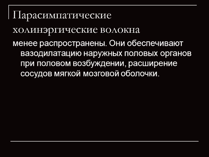 Парасимпатические холинэргические волокна менее распространены. Они обеспечивают вазодилатацию наружных половых органов при половом возбуждении, расширение сосудов мягкой мозговой оболочки.