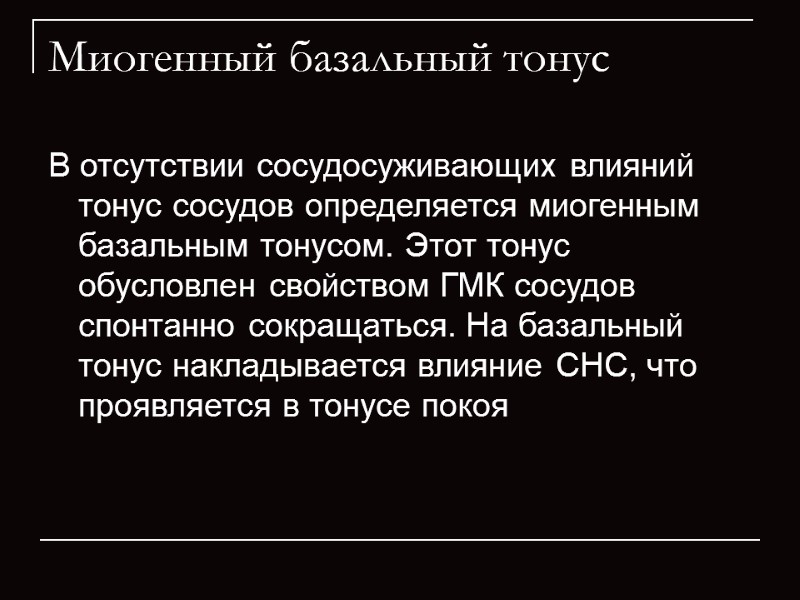 Миогенный базальный тонус В отсутствии сосудосуживающих влияний тонус сосудов определяется миогенным базальным тонусом. Этот тонус обусловлен свойством ГМК сосудов спонтанно сокращаться. На базальный тонус накладывается влияние СНС, что проявляется в тонусе покоя