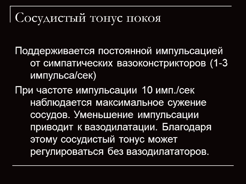Сосудистый тонус покоя Поддерживается постоянной импульсацией от симпатических вазоконстрикторов (1-3 импульса/сек) При частоте импульсации 10 имп./сек наблюдается максимальное сужение сосудов. Уменьшение импульсации приводит к вазодилатации. Благодаря этому сосудистый тонус может регулироваться без вазодилататоров.