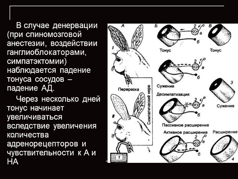 В случае денервации (при спиномозговой анестезии, воздействии ганглиоблокаторами, симпатэктомии) наблюдается падение тонуса сосудов – падение АД. Через несколько дней тонус начинает увеличиваться вследствие увеличения количества адренорецепторов и чувствительности к А и НА