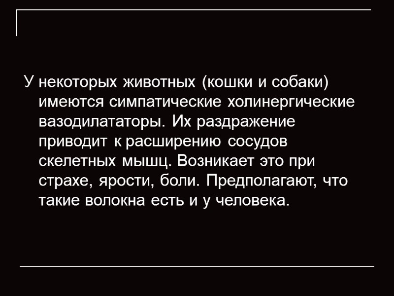 У некоторых животных (кошки и собаки) имеются симпатические холинергические вазодилататоры. Их раздражение приводит к расширению сосудов скелетных мышц. Возникает это при страхе, ярости, боли. Предполагают, что такие волокна есть и у человека.