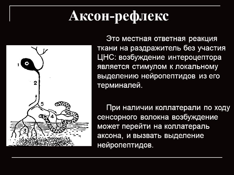 Аксон-рефлекс Это местная ответная реакция ткани на раздражитель без участия ЦНС: возбуждение интероцептора является стимулом к локальному выделению нейропептидов из его терминалей. При наличии коллатерали по ходу сенсорного волокна возбуждение может перейти на коллатераль аксона, и вызвать выделение нейропептидов.