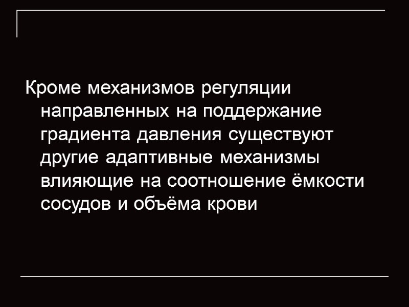 Кроме механизмов регуляции направленных на поддержание градиента давления существуют другие адаптивные механизмы влияющие на соотношение ёмкости сосудов и объёма крови
