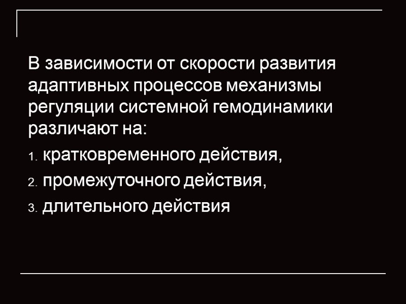 В зависимости от скорости развития адаптивных процессов механизмы регуляции системной гемодинамики различают на: кратковременного действия, промежуточного действия, длительного действия
