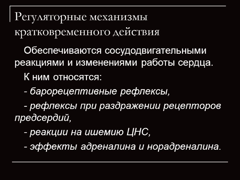 Регуляторные механизмы кратковременного действия Обеспечиваются сосудодвигательными реакциями и изменениями работы сердца. К ним относятся: - барорецептивные рефлексы, - рефлексы при раздражении рецепторов предсердий, - реакции на ишемию ЦНС, - эффекты адреналина и норадреналина.