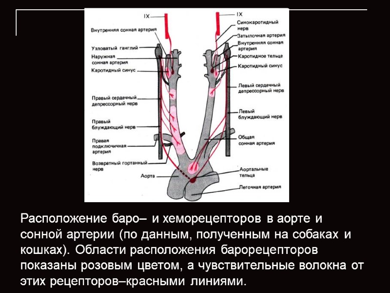 Расположение баро– и хеморецепторов в аорте и сонной артерии (по данным, полученным на собаках и кошках). Области расположения барорецепторов показаны розовым цветом, а чувствительные волокна от этих рецепторов–красными линиями.