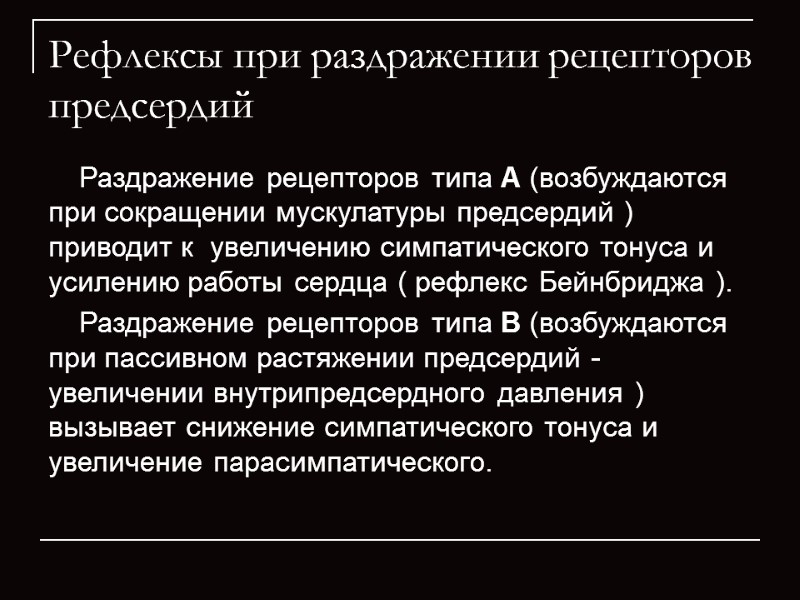 Рефлексы при раздражении рецепторов предсердий Раздражение рецепторов типа А (возбуждаются при сокращении мускулатуры предсердий ) приводит к увеличению симпатического тонуса и усилению работы сердца ( рефлекс Бейнбриджа ). Раздражение рецепторов типа В (возбуждаются при пассивном растяжении предсердий - увеличении внутрипредсердного давления ) вызывает снижение симпатического тонуса и увеличение парасимпатического.