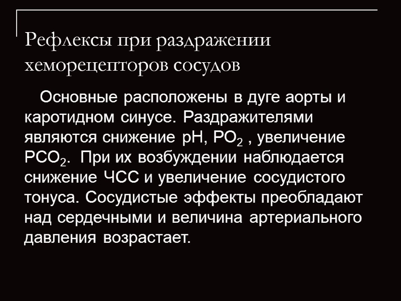 Рефлексы при раздражении хеморецепторов сосудов Основные расположены в дуге аорты и каротидном синусе. Раздражителями являются снижение рН, РО2 , увеличение РСО2. При их возбуждении наблюдается снижение ЧСС и увеличение сосудистого тонуса. Сосудистые эффекты преобладают над сердечными и величина артериального давления возрастает.