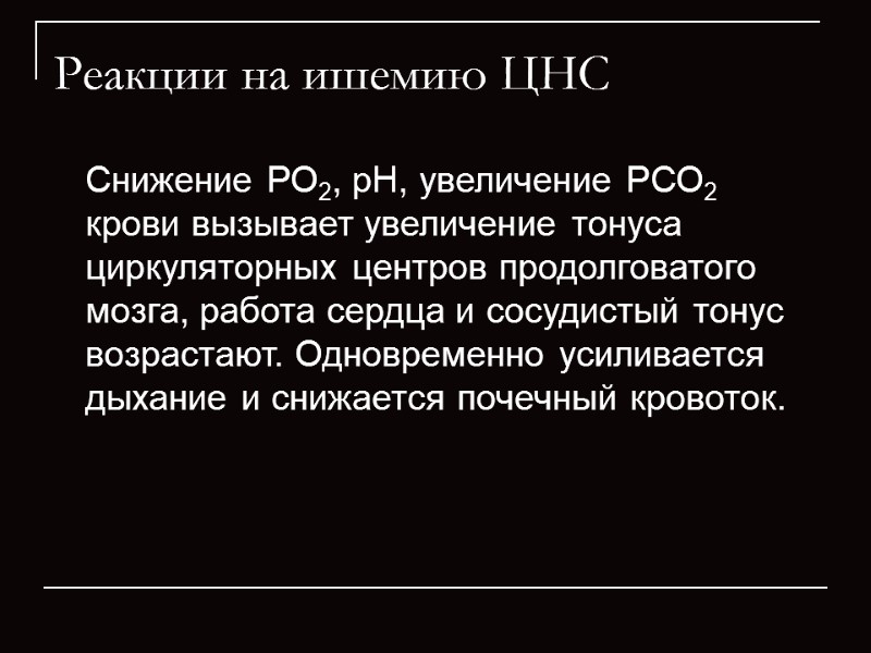 Реакции на ишемию ЦНС Снижение РО2, рН, увеличение РСО2 крови вызывает увеличение тонуса циркуляторных центров продолговатого мозга, работа сердца и сосудистый тонус возрастают. Одновременно усиливается дыхание и снижается почечный кровоток.