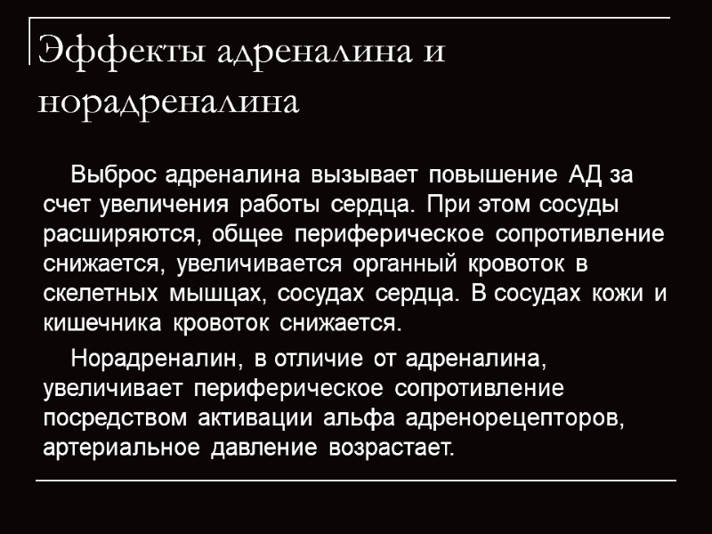 Эффекты адреналина и норадреналина Выброс адреналина вызывает повышение АД за счет увеличения работы сердца. При этом сосуды расширяются, общее периферическое сопротивление снижается, увеличивается органный кровоток в скелетных мышцах, сосудах сердца. В сосудах кожи и кишечника кровоток снижается. Норадреналин, в отличие от адреналина, увеличивает периферическое сопротивление посредством активации альфа адренорецепторов, артериальное давление возрастает.