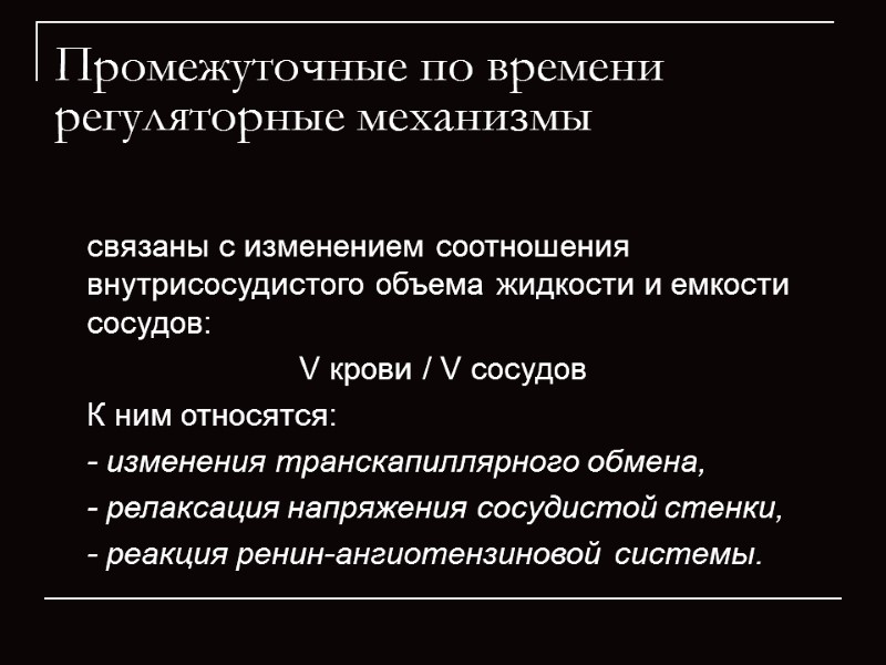 Промежуточные по времени регуляторные механизмы связаны с изменением соотношения внутрисосудистого объема жидкости и емкости сосудов: V крови / V сосудов К ним относятся: - изменения транскапиллярного обмена, - релаксация напряжения сосудистой стенки, - реакция ренин-ангиотензиновой системы.