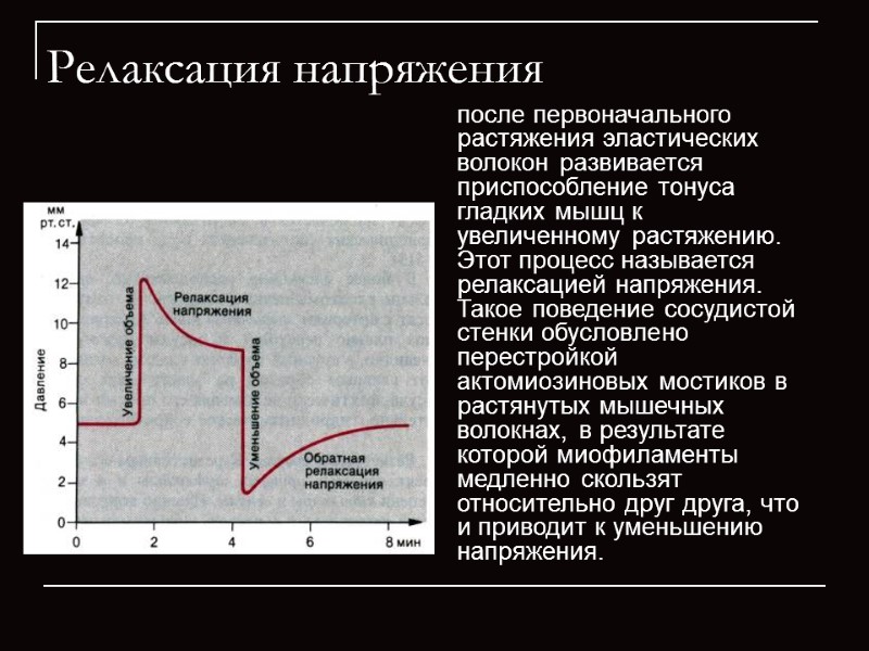Релаксация напряжения после первоначального растяжения эластических волокон развивается приспособление тонуса гладких мышц к увеличенному растяжению. Этот процесс называется релаксацией напряжения. Такое поведение сосудистой стенки обусловлено перестройкой актомиозиновых мостиков в растянутых мышечных волокнах, в результате которой миофиламенты медленно скользят относительно друг друга, что и приводит к уменьшению напряжения.