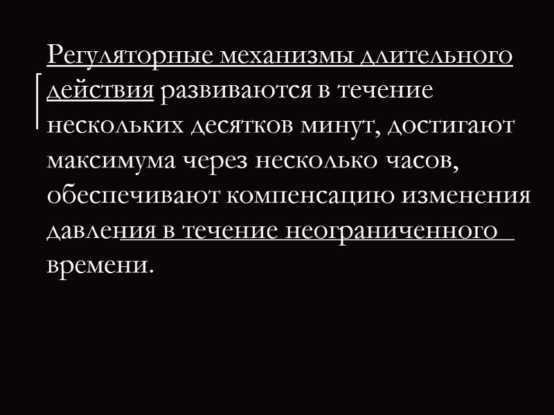 Регуляторные механизмы длительного действия развиваются в течение нескольких десятков минут, достигают максимума через несколько часов, обеспечивают компенсацию изменения давления в течение неограниченного времени.