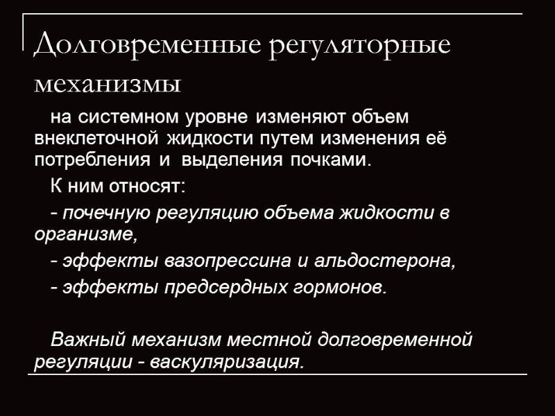 Долговременные регуляторные механизмы на системном уровне изменяют объем внеклеточной жидкости путем изменения её потребления и выделения почками. К ним относят: - почечную регуляцию объема жидкости в организме, - эффекты вазопрессина и альдостерона, - эффекты предсердных гормонов. Важный механизм местной долговременной регуляции - васкуляризация.