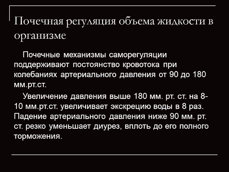 Почечная регуляция объема жидкости в организме Почечные механизмы саморегуляции поддерживают постоянство кровотока при колебаниях артериального давления от 90 до 180 мм.рт.ст. Увеличение давления выше 180 мм. рт. ст. на 8-10 мм.рт.ст. увеличивает экскрецию воды в 8 раз. Падение артериального давления ниже 90 мм. рт. ст. резко уменьшает диурез, вплоть до его полного торможения.