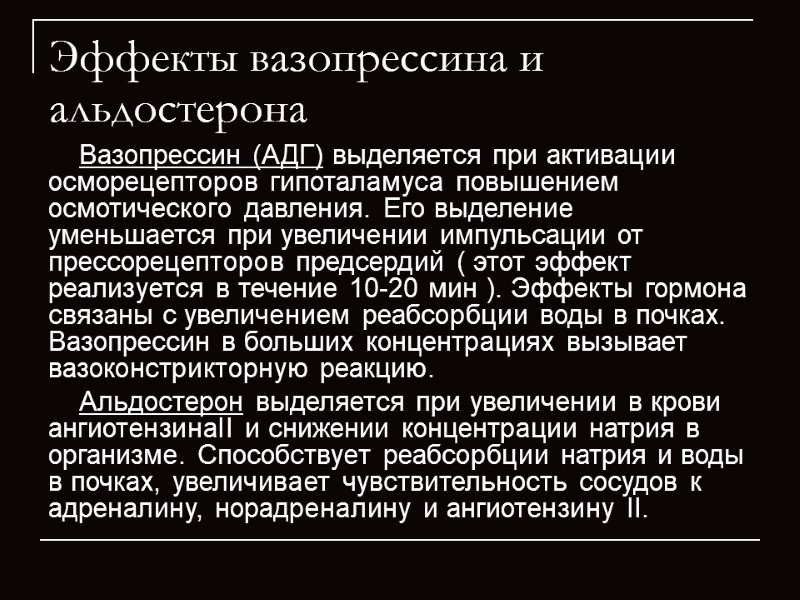 Эффекты вазопрессина и альдостерона Вазопрессин (АДГ) выделяется при активации осморецепторов гипоталамуса повышением осмотического давления. Его выделение уменьшается при увеличении импульсации от прессорецепторов предсердий ( этот эффект реализуется в течение 10-20 мин ). Эффекты гормона связаны с увеличением реабсорбции воды в почках. Вазопрессин в больших концентрациях вызывает вазоконстрикторную реакцию. Альдостерон выделяется при увеличении в крови ангиотензинаII и снижении концентрации натрия в организме. Способствует реабсорбции натрия и воды в почках, увеличивает чувствительность сосудов к адреналину, норадреналину и ангиотензину II.
