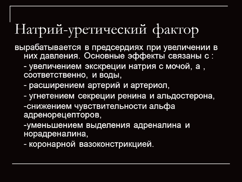 Натрий-уретический фактор вырабатывается в предсердиях при увеличении в них давления. Основные эффекты связаны с : - увеличением экскреции натрия с мочой, а , соответственно, и воды, - расширением артерий и артериол, - угнетением секреции ренина и альдостерона, -снижением чувствительности альфа адренорецепторов, -уменьшением выделения адреналина и норадреналина, - коронарной вазоконстрикцией.