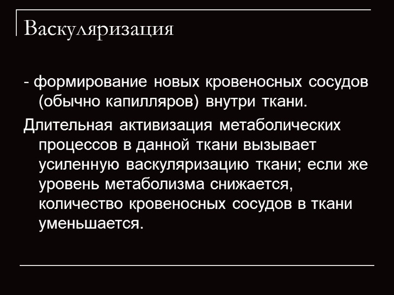 Васкуляризация - формирование новых кровеносных сосудов (обычно капилляров) внутри ткани. Длительная активизация метаболических процессов в данной ткани вызывает усиленную васкуляризацию ткани; если же уровень метаболизма снижается, количество кровеносных сосудов в ткани уменьшается.