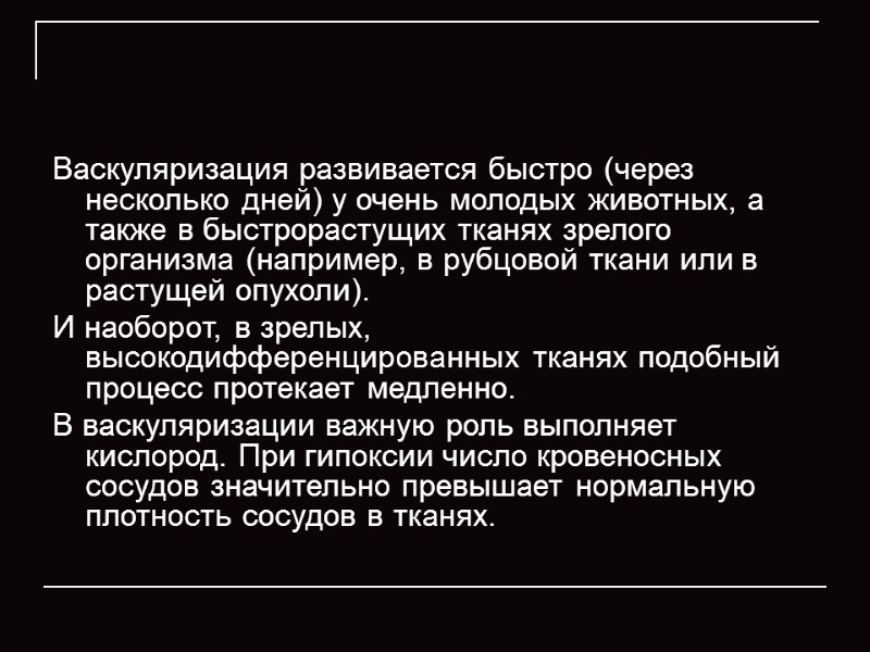 Васкуляризация развивается быстро (через несколько дней) у очень молодых животных, а также в быстрорастущих тканях зрелого организма (например, в рубцовой ткани или в растущей опухоли). И наоборот, в зрелых, высокодифференцированных тканях подобный процесс протекает медленно. В васкуляризации важную роль выполняет кислород. При гипоксии число кровеносных сосудов значительно превышает нормальную плотность сосудов в тканях.
