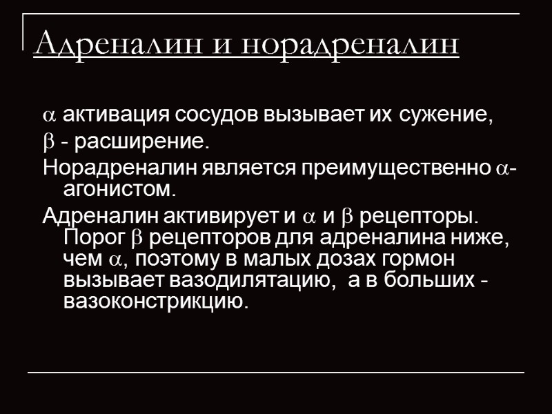 Адреналин и норадреналин активация сосудов вызывает их сужение, - расширение. Норадреналин является преимущественно -агонистом. Адреналин активирует и и рецепторы. Порог рецепторов для адреналина ниже, чем , поэтому в малых дозах гормон вызывает вазодилятацию, а в больших - вазоконстрикцию.