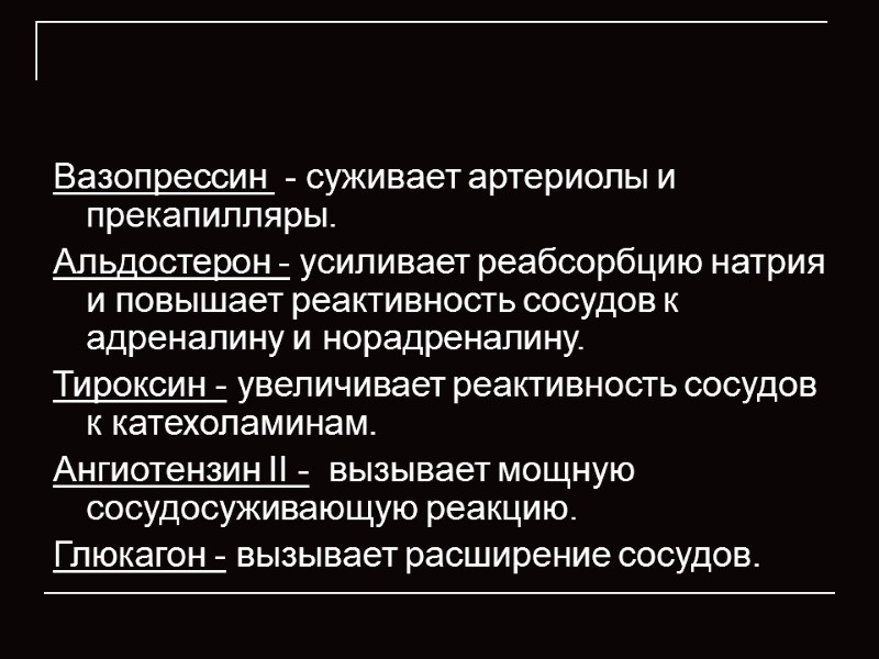 Вазопрессин - суживает артериолы и прекапилляры. Альдостерон - усиливает реабсорбцию натрия и повышает реактивность сосудов к адреналину и норадреналину. Тироксин - увеличивает реактивность сосудов к катехоламинам. Ангиотензин II - вызывает мощную сосудосуживающую реакцию. Глюкагон - вызывает расширение сосудов.