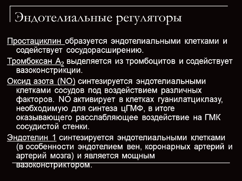 Эндотелиальные регуляторы Простациклин образуется эндотелиальными клетками и содействует сосудорасширению. Тромбоксан A2 выделяется из тромбоцитов и содействует вазоконстрикции. Оксид азота (NO) синтезируется эндотелиальными клетками сосудов под воздействием различных факторов. NO активирует в клетках гуанилатциклазу, необходимую для синтеза цГМФ, в итоге оказывающего расслабляющее воздействие на ГМК сосудистой стенки. Эндотелин 1 синтезируется эндотелиальными клетками (в особенности эндотелием вен, коронарных артерий и артерий мозга) и является мощным вазоконстриктором.
