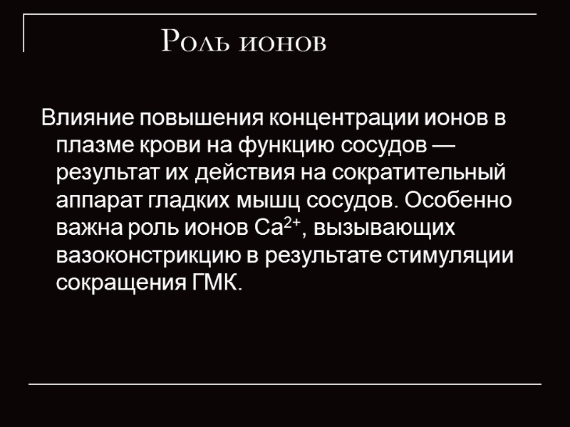 Роль ионов Влияние повышения концентрации ионов в плазме крови на функцию сосудов — результат их действия на сократительный аппарат гладких мышц сосудов. Особенно важна роль ионов Ca2+, вызывающих вазоконстрикцию в результате стимуляции сокращения ГМК.