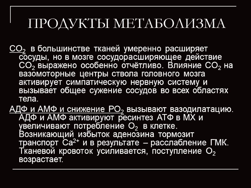 ПРОДУКТЫ МЕТАБОЛИЗМА CO2 в большинстве тканей умеренно расширяет сосуды, но в мозге сосудорасширяющее действие CO2 выражено особенно отчётливо. Влияние CO2 на вазомоторные центры ствола головного мозга активирует симпатическую нервную систему и вызывает общее сужение сосудов во всех областях тела. АДФ и АМФ и снижение РО2 вызывают вазодилатацию. АДФ и АМФ активируют ресинтез АТФ в МХ и увеличивают потребление О2 в клетке. Возникающий избыток аденозина тормозит транспорт Са2+ и в результате – расслабление ГМК. Тканевой кровоток усиливается, поступление О2 возрастает.