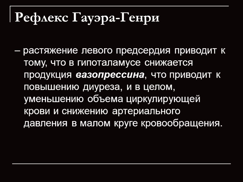Рефлекс Гауэра-Генри – растяжение левого предсердия приводит к тому, что в гипоталамусе снижается продукция вазопрессина, что приводит к повышению диуреза, и в целом, уменьшению объема циркулирующей крови и снижению артериального давления в малом круге кровообращения.
