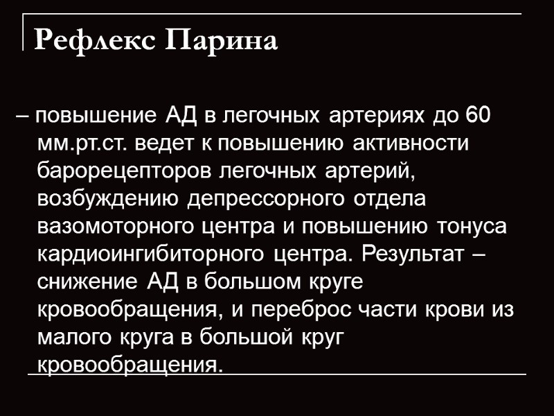 Рефлекс Парина – повышение АД в легочных артериях до 60 мм.рт.ст. ведет к повышению активности барорецепторов легочных артерий, возбуждению депрессорного отдела вазомоторного центра и повышению тонуса кардиоингибиторного центра. Результат – снижение АД в большом круге кровообращения, и переброс части крови из малого круга в большой круг кровообращения.